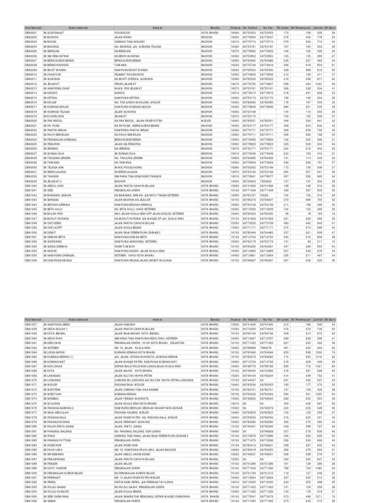 Pada 2009, sekolah kebangsaan pendidikan khas kelantan memiliki 56 pelajar lelaki dan 59 pelajar perempuan, menjadikan jumlah keseluruhan murid seramai 115 . Pendidikan khas adalah perkhidmatan dan kemudahan pendidikan yang. Senarai sekolah ppd kota bharu, kelantan beserta alamat, nombor telefon, nombor faks,. Kelantan ialah sebuah negeri di malaysia. Sekolah kebangsaan pendidikan khas kelantan . Senarai sekolah rendah pendidikan khas kuala lumpur 319, 317, kelantan, dba0001, sekolah kebangsaan alor bakat .